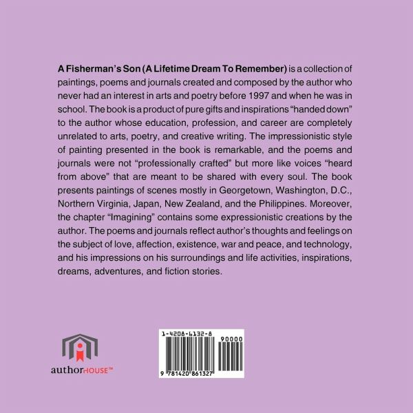 A Fisherman's Son (A Lifetime Dream To Remember) is a collection of paintings, poems and journals created and composed by the author who never had an interest in arts and poetry before 1997 and when he was in school. The book is a product of pure gifts and inspirations "handed down" to the author whose education, profession, and career are completely unrelated to arts, poetry, and creative writing. The impressionistic style of painting presented in the book is remarkable, and the poems and journals were not "professionally crafted" but more like voices "heard from above" that are meant to be shared with every soul. The book presents paintings of scenes mostly in Georgetown, Washington, D.C., Northern Virginia, Japan, New Zealand, and the Philippines. Moreover, the chapter "Imagining" contains some expressionistic creations by the author. The poems and journals reflect author's thoughts and feelings on the subject of love, affection, existence, war and peace, and technology, and his impressions on his surroundings and life activities, inspirations, dreams, adventures, and fiction stories.