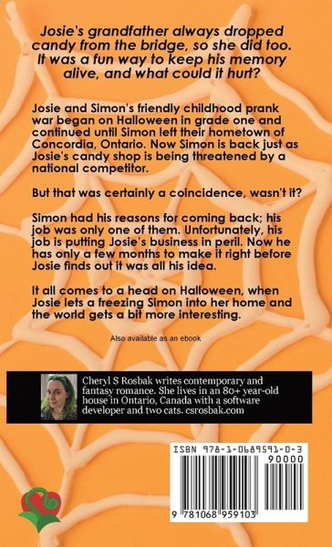 Josie's grandfather always dropped candy from the bridge, so she did too. It was a fun way to keep his memory alive, and what could it hurt? Josie and Simon's friendly childhood prank war began on Halloween in grade one and continued until Simon left their hometown of Concordia, Ontario. Now Simon is back just as Josie's candy shop is being threatened by a national competitor. But that was certainly a coincidence, wasn't it? Simon had his reasons for coming back; his job was only one of them. Unfortunately, his job is putting Josie's business in peril. Now he has only a few months to make it right before Josie finds out it was all his idea. It all comes to a head on Halloween, when Josie lets a freezing Simon into her home and the world gets a bit more interesting.