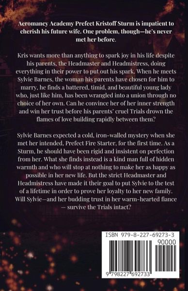 Aeromancy Academy Prefect Kristoff Sturm is impatient to cherish his future wife. One problem, though-he's never met her before. Kris wants more than anything to spark joy in his life despite his parents, the Headmaster and Headmistress, doing everything in their power to put out his spark. When he meets Sylvie Barnes, the woman his parents have chosen for him to marry, he finds a battered, timid, and beautiful young lady who, just like him, has been wrangled into a union through no choice of her own. Can he convince her of her inner strength and win her trust before his parents' cruel Trials drown the flames of love building rapidly between them? Sylvie Barnes expected a cold, iron-walled mystery when she met her intended, Prefect Fire Starter, for the first time. As a Sturm, he should have been rigid and insistent on perfection from her. What she finds instead is a kind man full of hidden warmth and who will stop at nothing to make her as happy as possible in her new life. But the strict Headmaster and Headmistress have made it their goal to put Sylvie to the test of a lifetime in order to prove her loyalty to her new family. Will Sylvie-and her budding trust in her warm-hearted fiance- survive the Trials intact?