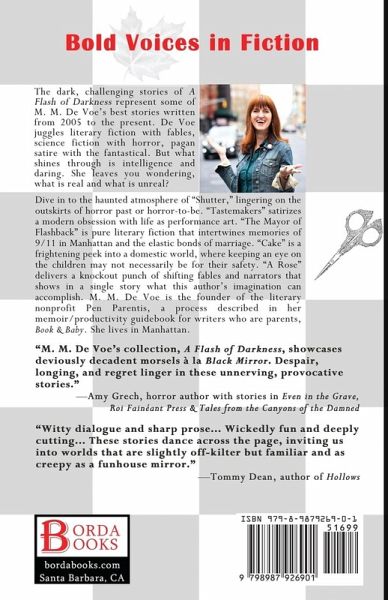 Flash Fiction writing legend Tommy Dean called this debut collection "wickedly fun, deeply cutting, and as creepy as a funhouse mirror." Meet award-winning author M. M. De Voe in a collection of dark, challenging stories that represent some of her best writing in short fiction from 2005 to the present. Part of Borda Books' series of BOLD VOICES IN FICTION, in this exciting debut anthology, DeVoe juggles literary fiction with fables, science fiction with horror, pagan satire with the fantastical. What shines through in these quirky tales is intelligence and daring. What is real and what is unreal? Terese Svoboda, author of Dog on Fire, says, "Milda De Voe gives you femme Kafka in A Flash of Darkness - but American style: 'with nosies and lights that simulate the beautiful side of violence.' The stories cruise the scene with a chess-playing vicious granny and a Svetlana lounging against a furry elk, 'calling to mind every vodka ad young American Jim had ever taped to a dorm room ceiling,' One swain can't hold his date's hand ; though she has left it on the table: a treat between beers.' De Voe's especially brilliant on family life, and ends the book with a quirky story about a husband and what else? Horror." Certain to appeal to fans of Black Mirror, Twilight Zone, and Kelly Link, the stories in A Flash of Darkness "dance across the page" and engage dark humor, satire, and plenty of provocative narratives. The cast of characters is unforgettable. "M. M. De Voe's collection, A Flash of Darkness, showcases deviously decadent morsels in the vein of Black Mirror. Despair, longing, and regret linger in these unnerving, provocative stories." -Amy Grech, horror author M. M. De Voe's odd, dark stories represent some of her best stories from 2005 to the present. De Voe juggles literary fiction with fables, science fiction with horror, pagan satire with the fantastical. But what shines through is intelligence and daring. The ability to write from the point of view of a variety of narrators-some worthy, even heroic, others flawed to the extreme. De Voe leaves you wondering, what is real and what is unreal? Who are the reliable narrators and who are inglorious charlatans? Dive in to the haunted atmosphere of "Shutter," as we linger on the outskirts of horror past or horror-to-be. "Tastemakers" satirizes a modern obsession with life as performance art. "The Mayor of Flashback" is pure literary fiction that intertwines memories of 9/11 in Manhattan, Russian escapades, and the sometimes elastic bonds of marriage. "Empty" takes us into a corporate Twilight Zone, while "Cake" is a frightening peek into a domestic world, where keeping an eye on the children may not necessarily be for their safety. Toward the end, "A Rose" delivers a knockout punch of shifting fables and narrators that shows in a single story what this author's imagination can accomplish. M. M. De Voe is an internationally published fictionista who once danced for the Pope and later ran away with a group of jugglers. Her writing has won over twenty awards. Columbia University Writing Fellow, MFA under Michael Cunningham and Matthew Sharpe. Founder of the literary nonprofit Pen Parentis, a process described in her memoir/productivity guidebook for writers who are parents, Book & Baby. Inaugural member of the Lithuanian Writers of the Diaspora Forum. She lives in Manhattan.
