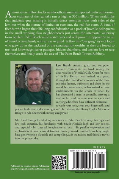 A fast-paced crime novel based upon the internationally known, 30-year old, unsolved mystery of the Palm beach Towers Robbery. The story has many twists, and it's heroes and heroines are locals, who use their "local knowledge" to take on an old-world organized crime family which has been obsessed for decades with one question - "Who pulled this job, and where are they hiding?" The descriptions of the Palm Beach landmarks allow readers to visualize the wealth and opulence of the 1%, and to also to see the frailties in human nature which prevade every strata of society. The author uses tough guys, fast cars, high tech, and geographic peculiarities to stay ahead of the gangsters and win the day.