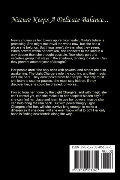 Nature keeps a delicate balance... Newly chosen as her town's apprentice healer, Marla's future is promising. She might not travel the world now, but she has a place she belongs. But things aren't always what they seem. When powers within her awaken, she connects to the land in a way deeper than she thought possible. Now she's part of a secretive group that stays in the shadows, tending to nature. Can they prevent another year of drought? Her people aren't the only ones with powers, and others are also awakening. The Light Chargers rule the country, and their magic isn't like hers. They draw power from her people. Not only must she learn to use her powers, she must stay hidden. If they discover her, she could be drained, or worse... Forced from her home by the Light Chargers, and with magic she can't control yet, can she make it to her people's hidden city? If she can find her place and learn to use her powers, maybe she can help bring the rain back. But with power hungry Light Chargers after her, will she survive long enough to make a difference? If she does, will she even know what to do? Her only hope is finding new friends along the way...