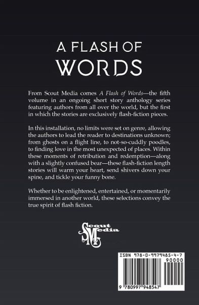 From Scout Media comes A Flash of Words—the fifth volume in an ongoing short story anthology series featuring authors from all over the world, but the first in which the stories are exclusively flash-fiction pieces. In this installation, no limits were set on genre, allowing the authors to lead the reader to destinations unknown; from ghosts on a flight line, to not-so-cuddly poodles, to finding love in the most unexpected of places. Within these moments of retribution and redemption—along with a slightly confused bear—these flash-fiction length stories will warm your heart, send shivers down your spine, and tickle your funny bone. Whether to be enlightened, entertained, or momentarily immersed in another world, these selections convey the true spirit of flash fiction.