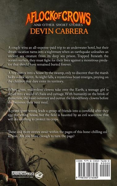 A couple wins an all-expense-paid trip to an underwater hotel, but their dream vacation turns into a nightmare when an earthquake unleashes an ancient sea creature from its deep sea prison. Trapped Beneath the ocean's surface, they must fight for their lives against a monstrous predator that should have remained buried forever. A boy moves into a house by the swamp, only to discover that the marsh hides a dark secret. As night falls, a mysterious beast emerges, preying on the children that dare enter its territory. When giant, malevolent clowns invade Earth, a teenage girl is thrust into a world of chaos and carnage. With humanity on the brink of extinction, she must outsmart and outrun the bloodthirsty clowns before she becomes their next meal. A prank gone wrong leads a group of friends into a cornfield after they egg the wrong house, but the field is haunted by an evil scarecrow that will do anything to protect its crops. These and more stories await within the pages of this bone-chilling collection. Are you brave enough to turn the page?