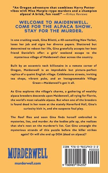 Welcome to Maidenwell. Come for the alpaca show. Stay for the murder. The first book in a brand-new series perfect for Richard Osman readers and all fans of utterly delightful and page-turning whodunnits. In one crushing week, Gina Biletti, a 40-something New Yorker, loses her job and signs her divorce papers. Shattered but determined to reboot her life, Gina gratefully accepts her best friend Danielle's offer: a girls' weekend escape to the mysterious village of Maidenwell clear across the country. Built by an eccentric tech billionaire in a remote corner of Oregon, Maidenwell is an improbable but picture-perfect replica of a quaint English village. Cobblestone streets, inviting tea shops, vibrant pubs, and an Instagrammable Village Green-Maidenwell's got it all. As Gina explores the village's charms, a gathering of wealthy alpaca breeders descends upon Maidenwell, all vying for Florrie, the world's most valuable alpaca. But when one of the breeders is found dead in her room at the stately Haverford Hall, Gina's curiosity kick in, and she suspects foul play. The floof flies and soon Gina finds herself embroiled in mysteries, lies, and murder. As the bodies pile up, she realizes that she's next on the murderer's list. Can Gina untangle the mysterious strands of this puzzle before the killer strikes again? Or will she end up DOA (dead on alpaca)? Drawing on classic whodunnit vibes with a modern twist, this fast-paced, deliciously witty mystery will enthrall you from start to finish. If you love M.C. Beaton, Frances Evesham, and Agatha Christie, welcome to Maidenwell-or should we say Murderwell...