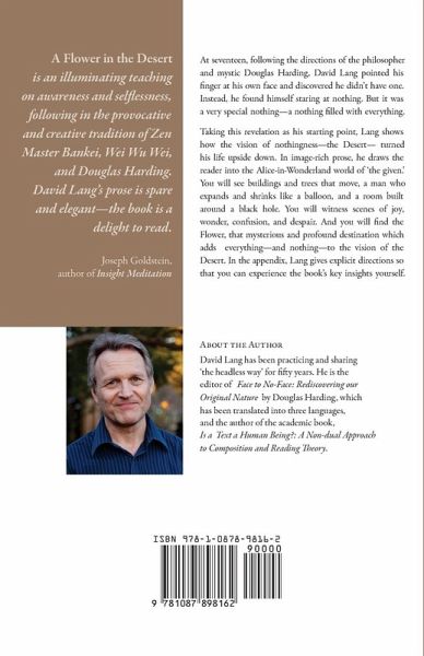 At seventeen, following the directions of the philosopher and mystic Douglas Harding, David Lang pointed his finger at his own face and discovered he didn't have one. Instead, he found himself staring at nothing. But it was a very special nothing-a nothing filled with everything. Taking this revelation as his starting point, Lang shows how the vision of nothingness-the Desert-turned his life upside down. In image-rich language, he draws the reader into the Alice-in-Wonderland world of 'the given.' You will see buildings and trees that move, a man who expands and shrinks like a balloon, and a room built around a black hole. You will witness scenes of joy, wonder, confusion, and despair. And you will find the Flower, that mysterious and profound destination which adds everything-and nothing-to the vision of the Desert. In the appendix, Lang gives explicit directions so that you can experience the book's key insights yourself.