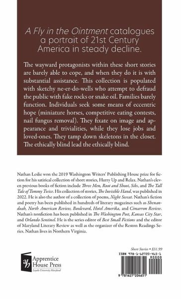 A Fly in the Ointment catalogues a portrait of 21st Century America in steady decline. The wayward protagonists within these short stories are barely able to cope, and when they do it is with substantial assistance. This collection is populated with sketchy ne-er-do-wells who attempt to defraud the public with fake rocks or snake oil. Families barely function. Individuals seek some means of eccentric hope (miniature horses, competitive eating contests, nail fungus removal). They fixate on image and appearance and trivialities, while they lose jobs and loved-ones. They tamp down skeletons in the closet. The ethically blind lead the ethically blind.