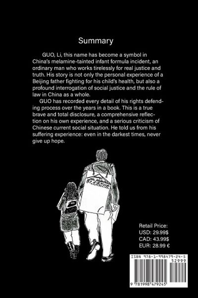 Summary GUO, Li, this name has become a symbol in China's melamine-tainted infant formula incident, an ordinary man who works tirelessly for real justice and truth. His story is not only the personal experience of a Beijing father fighting for his child's health, but also a profound interrogation of social justice and the rule of law in China as a whole. GUO has recorded every detail of his rights defending process over the years in a book. This is a true brave and total disclosure, a comprehensive reflection on his own experience, and a serious criticism of Chinese current social situation. He told us from his suffering experience: even in the darkest times, never give up hope.