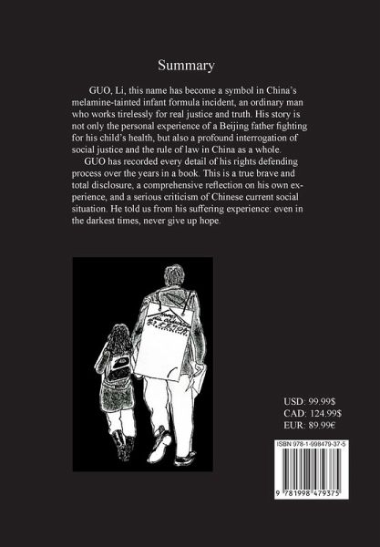 GUO, Li, this name has become a symbol in China's melamine-tainted infant formula incident, an ordinary man who works tirelessly for real justice and truth. His story is not only the personal experience of a Beijing father fighting for his child's health, but also a profound interrogation of social justice and the rule of law in China as a whole. GUO has recorded every detail of his rights defending process over the years in a book. This is a true brave and total disclosure, a comprehensive reflection on his own experience, and a serious criticism of Chinese current social situation. He told us from his suffering experience: even in the darkest times, never give up hope.