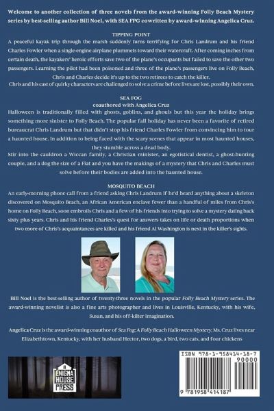 Welcome to another collection of three novels from the award-winning Folly Beach Mystery series by best-selling author Bill Noel, with SEA FPG cowritten by award-winning Angelica Cruz. TIPPING POINT A peaceful kayak trip through the marsh suddenly turns terrifying for Chris Landrum and his friend Charles Fowler when a single-engine airplane plummets toward their watercraft. After coming inches from certain death, the kayakers' heroic efforts save two of the plane's occupants but failed to save the other two passengers. Learning the pilot had been poisoned and three of the plane's passengers live on Folly Beach, Chris and Charles decide it's up to the two retirees to catch the killer. Chris and his cast of quirky characters are challenged to solve a crime before lives are lost, possibly their own. SEA FOG coauthored with Angelica Cruz Halloween is traditionally filled with ghosts, goblins, and ghouls but this year the holiday brings something more sinister to Folly Beach. The popular fall holiday has never been a favorite of retired bureaucrat Chris Landrum but that didn't stop his friend Charles Fowler from convincing him to tour a haunted house. In addition to being faced with the scary scenes that appear in most haunted houses, they stumble across a dead body. Stir into the cauldron a Wiccan family, a Christian minister, an egotistical dentist, a ghost-hunting couple, and a dog the size of a Fiat and you have the makings of a mystery that Chris and Charles must solve before their bodies are added into the haunted house. MOSQUITO BEACH An early-morning phone call from a friend asking Chris Landrum if he'd heard anything about a skeleton discovered on Mosquito Beach, an African American enclave fewer than a handful of miles from Chris's home on Folly Beach, soon embroils Chris and a few of his friends into trying to solve a mystery dating back sixty plus years. Chris and his friend Charles's quest for answers takes on life or death proportions when two more of Chris's acquaintances are killed and his friend Al Washington is next in the killer's sights. A FOLLY BEACH MYSTERY COLLECTION IV Author Bios Bill Noel is the best-selling author of twenty-four novels in the popular Folly Beach Mystery series. The award-winning novelist is also a fine arts photographer and lives in Louisville, Kentucky, with his wife, Susan, and his off-kilter imagination. Angelica Cruz is the award-winning coauthor of Sea Fog: A Folly Beach Halloween Mystery and Pretty Paper: A Folly Beach Christmas Mystery. Ms. Cruz lives near Elizabethtown, Kentucky, with her husband Hector, two dogs, a bird, two cats, and four chickens.