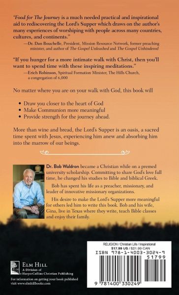 "A beautifully reflective book--an allegorical, poetic masterpiece about communion that will enrich the life of the Christian whether a new or seasoned follower. A gem of a read that can be read, re-read, and shared with loved ones." -- Nonfiction Authors Association No matter where you are on your walk with God, this award-winning devotional on the Lord's Supper will: Draw you closer to the heart of God Make Communion more meaningful Enrich your experience with Christ Increase your sense of the sacred Provide strength for your journey. More than wine and bread, Communion is an oasis, a sacred time spent with Jesus at the Table. Written conversationally, Food for the Journey is enriched with insights gleaned from Bob's experiences with cultures around the world.