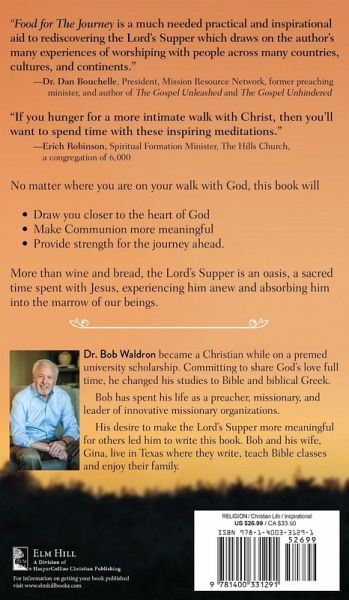 "A beautifully reflective book--an allegorical, poetic masterpiece about communion that will enrich the life of the Christian whether a new or seasoned follower. A gem of a read that can be read, re-read, and shared with loved ones." -- Nonfiction Authors Association No matter where you are on your walk with God, this award-winning devotional on the Lord's Supper will: Draw you closer to the heart of God Make Communion more meaningful Enrich your experience with Christ Increase your sense of the sacred Provide strength for your journey. More than wine and bread, Communion is an oasis, a sacred time spent with Jesus at the Table. Written conversationally, Food for the Journey is enriched with insights gleaned from Bob's experiences with cultures around the world.