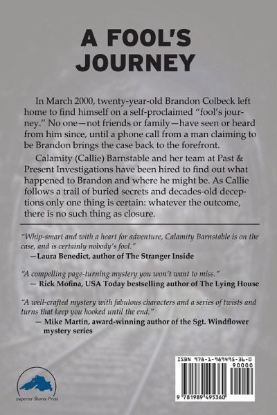 In March 2000, twenty-year-old Brandon Colbeck left home to find himself on a self-proclaimed "fool’s journey." No one—not friends or family—have seen or heard from him since, until a phone call from a man claiming to be Brandon brings the case back to the forefront. Calamity (Callie) Barnstable and her team at Past & Present Investigations have been hired to find out what happened to Brandon and where he might be. As Callie follows a trail of buried secrets and decades-old deceptions only one thing is certain: whatever the outcome, there is no such thing as closure.