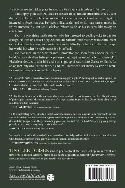 A Footnote to Plato takes place in 2012 at a tiny liberal arts college in Vermont. Philosophy professor Dr. Isaac Fischelson finds himself embroiled in a student drama that leads to a false accusation of sexual harassment and an investigation intended to force him out. He faces a disgraceful end to his long career unless he retires immediately. But Dr. Fischelson refuses to be, as his students like to say, an epic failure. Zeb is a promising math student who has resorted to dealing coke to pay for college. He lives on a failed hippie commune with his toxic mother, who seems intent on bankrupting her son, both materially and spiritually. Zeb tries his best to escape her world, but what he really needs is a bit of luck. The two meet in the Maintenance Committee and soon form a Socrates-Plato bond. When Zeb offers to help the professor put together an online lecture series, Dr. Fischelson decides to take him and a small group of students to Greece to film it. It's an opportunity of a lifetime for Zeb and Dr. Fischelson's last chance to save his reputation--and maybe leave behind a legacy.