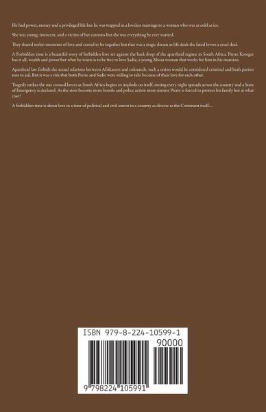 A Forbidden time is a beautiful story of forbidden love set against the back drop of the apartheid regime in South Africa. Pierre Kroeger has it all, wealth and power but what he wants is to be free to love Sadie, a young Xhosa woman that works for him in his mansion. Apartheid law forbids the sexual relations between Afrikaners and coloureds, such a union would be considered criminal and both parties sent to jail. But it was a risk that both Pierre and Sadie were willing to take because of their love for each other. Tragedy strikes the star crossed lovers as South Africa begins to implode on itself, rioting every night spreads across the country and a State of Emergency is declared. As the riots become more hostile and police action more sinister Pierre is forced to protect his family but at what cost? A forbidden time is about love in a time of political and civil unrest in a country as diverse as the Continent itself....