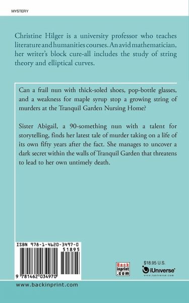 Can a frail nun with thick-soled shoes, pop-bottle glasses, and a weakness for maple syrup stop a growing string of murders at the Tranquil Garden Nursing Home? Sister Abigail, a 90-something nun with a talent for storytelling, finds her latest tale of murder taking on a life of its own fifty years after the fact. She manages to uncover a dark secret within the walls of Tranquil Garden that threatens to lead to her own untimely death.