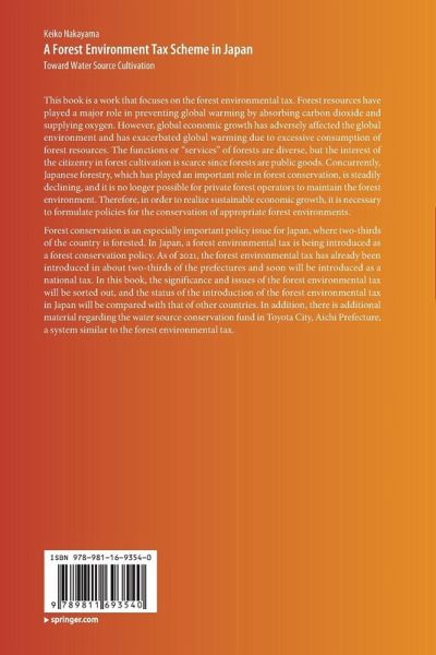 Forest conservation is an especially important policy issue for Japan, where two-thirds of the country is forested. InJapan, a forest environmental tax is being introduced as a forest conservation policy. As of 2021, the forest environmental tax has already been introduced in about two-thirds of the prefectures and soon will be introduced as a national tax. In this book, the significance and issues of the forest environmental tax will be sorted out, and the status of the introduction of the forest environmental tax in Japan will be compared with that of other countries. In addition, there is additional material regarding the water source conservation fund in Toyota City, Aichi Prefecture, a system similar to the forest environmental tax.