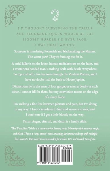I'd thought surviving the trials and becoming queen would be the biggest hurdle I'd ever face. I was dead wrong. Someone is murdering Potentials and blackmailing the Masters. The worst part? They're framing me for it. A serial killer is on the loose, human traffickers are on the hunt, and a mysterious hooded man is making deals with devils everywhere. To top it all off, a fire has torn through the Verdant Plateau, and I have no doubt it all ties back to House Jupiter. Distractions lie in the arms of four gorgeous men as deadly as each other. I cannot fall for them, but my conviction teeters on the edge of a sharp blade. I'm walking a fine line between pleasure and pain, but I'm doing it my way. I have a murderer to find and answers to seek, and I don't care if I get a little bloody on the way. I'm an Auger, after all, and death is a family affair. ¿The Terrulian Trials is a steamy urban fantasy series brimming with mystery, magic, and blood. This is a "why choose" novel, meaning the heroine ends up with multiple love interests. This novel is recommended for readers 18+ and is book two of six.