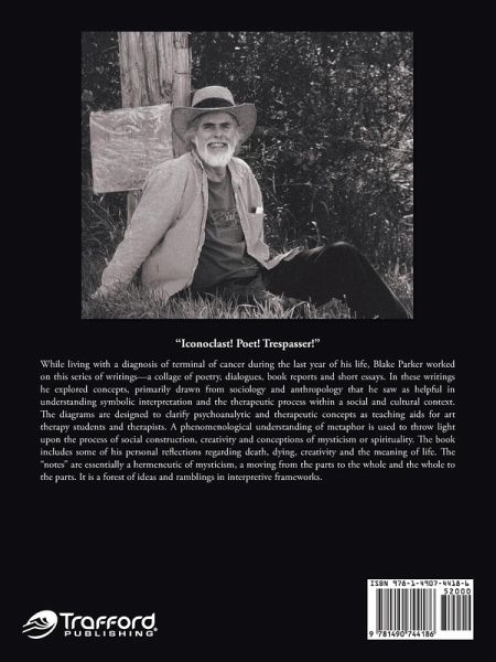 Blake Parker worked on this series of writings in the last year of his life while he lived with a terminal diagnosis of cancer. It is a mixture of poetry, dialogues, book reports, and short essays, formed as a sort of shorthand to a number of concepts, primarily from sociology and anthropology, which he saw as useful, if not actually essential, for understanding symbolic interpretation and the essence of the therapeutic process within a social and cultural context. He designed the psychoanalytic and therapeutic diagrams to clarify concepts and as teaching aids for art therapy students and therapists. Blake uses a phenomenological understanding of metaphor in order to throw light upon the process of social construction, creativity, and conceptions of mysticism or spirituality. The book includes some of his personal reflections regarding death, dying, creativity, and the meaning of life. The "notes" are essentially a hermeneutic of mysticism, a moving from the parts to the whole and the whole to the parts. It is a forest of ideas and ramblings in interpretive frameworks that emerged and is presented in a circular spiral.