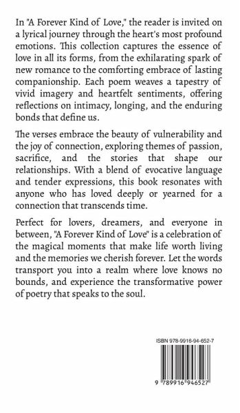 In "A Forever Kind of Love," the reader is invited on a lyrical journey through the heart's most profound emotions. This collection captures the essence of love in all its forms, from the exhilarating spark of new romance to the comforting embrace of lasting companionship. Each poem weaves a tapestry of vivid imagery and heartfelt sentiments, offering reflections on intimacy, longing, and the enduring bonds that define us. The verses embrace the beauty of vulnerability and the joy of connection, exploring themes of passion, sacrifice, and the stories that shape our relationships. With a blend of evocative language and tender expressions, this book resonates with anyone who has loved deeply or yearned for a connection that transcends time. Perfect for lovers, dreamers, and everyone in between, "A Forever Kind of Love" is a celebration of the magical moments that make life worth living and the memories we cherish forever. Let the words transport you into a realm where love knows no bounds, and experience the transformative power of poetry that speaks to the soul.