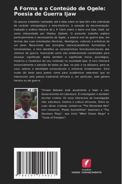 Os poucos trabalhos realizados até à data sobre os Ijaw têm sido sobretudo de carácter antropológico e etno-histórico, à exceção da documentação, tradução e análise literária de J. P. Clark sobre o épico oral Ijaw, Ozidi, tal como interpretado por Okabou Ojobolo. O presente trabalho explora particularmente o desempenho de Ogele, a poesia oral de guerra Ijaw, em termos das suas orientações literárias, ideológicas, culturais e artísticas de um povo. Recorrendo aos princípios teóricos/analíticos formalistas e funcionalistas, o livro identifica as características formais/estruturais dos cânticos de guerra, mostrando como são esteticamente combinados para alcançar significado. Avalia também o significado moral, psicológico, histórico e ritualístico do seu conteúdo na sociedade Ijaw. O livro chamará essencialmente a atenção de todos os Ijaw, no país e na diáspora, para os seus valores e identidade socioculturais e artísticos fundamentais. Será muito útil tanto para jovens como para académicos veteranos que se interessam pela poesia tradicional africana e, em particular, pelo género heroico ou de guerra.