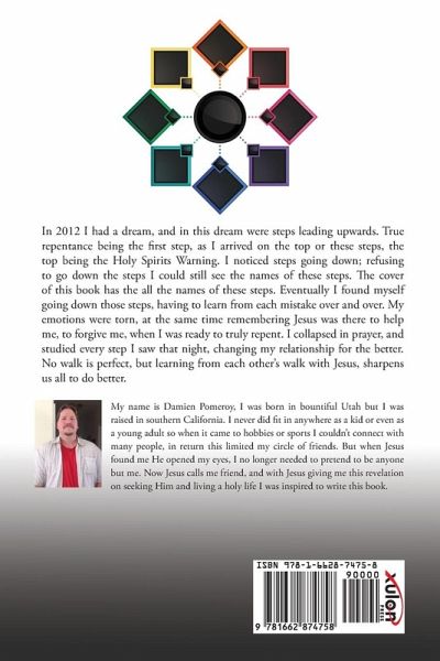 In 2012 I had a dream, and in this dream were steps leading upwards. True repentance being the first step, as I arrived on the top or these steps, the top being the Holy Spirits Warning. I noticed steps going down; refusing to go down the steps I could still see the names of these steps. The cover of this book has the all the names of these steps. Eventually I found myself going down those steps, having to learn from each mistake over and over. My emotions were torn, at the same time remembering Jesus was there to help me, to forgive me, when I was ready to truly repent. I collapsed in prayer, and studied every step I saw that night, changing my relationship for the better. No walk is perfect, but learning from each other's walk with Jesus, sharpens us all to do better. My name is Damien Pomeroy, I was born in bountiful Utah but I was raised in southern California. I never did fit in anywhere as a kid or even as a young adult so when it came to hobbies or sports I couldn't connect with many people, in return this limited my circle of friends. But when Jesus found me He opened my eyes, I no longer needed to pretend to be anyone but me. Now Jesus calls me friend, and with Jesus giving me this revelation on seeking Him and living a holy life I was inspired to write this book.