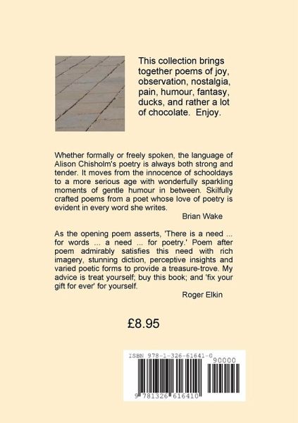 Alison Chisholm's eleventh collection brings together poems of joy, observation, nostalgia, pain, humour, fantasy and rather a lot of chocolate. Enjoy.