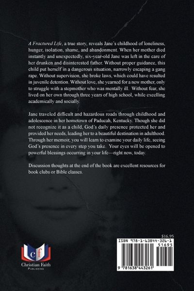 A Fractured Life, a true story, reveals Jane's childhood of loneliness, hunger, isolation, shame, and abandonment. When her mother died instantly and unexpectedly, six-year-old Jane was left in the care of her drunken and disinterested father. Without proper guidance, this child put herself in a dangerous situation, narrowly escaping a gang rape. Without supervision, she broke laws, which could have resulted in juvenile detention. Without love, she yearned for a new mother, only to struggle with a stepmother who was mentally ill. Without fear, she lived on her own through three years of high school, while excelling academically and socially. Jane traveled difficult and hazardous roads through childhood and adolescence in her hometown of Paducah, Kentucky. Though she did not recognize it as a child, God's daily presence protected her and provided her needs, leading her to a beautiful destination in adulthood. Through her memoir, you will learn to examine your daily life, seeing God's presence in every step you take. Your eyes will be opened to powerful blessings occurring in your life--right now, today. Discussion thoughts at the end of the book are excellent resources for book clubs or Bible classes.