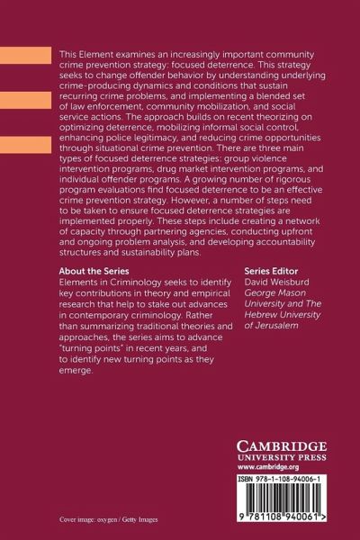 This Element examines an increasingly important community crime prevention strategy - focused deterrence. This strategy seeks to change offender behavior by understanding crime-producing dynamics and conditions that cause recurring crime problems, and implementing a mixed set of law enforcement, community mobilization, and social service actions.