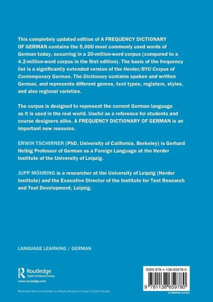 This completely updated edition of A Frequency Dictionary of German contains the 5,000 most commonly used words of German today, occurring in a 20-million-word corpus (compared to a 4.2-million-word corpus in the first edition). The basis of the frequency list is a significantly extended version of the Herder/BYU Corpus of Contemporary German. The Dictionary contains spoken and written German, and represents different genres, text types, registers, styles, and also regional varieties.