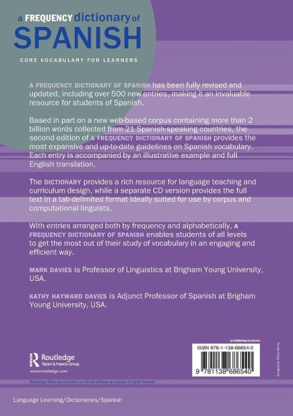 Based on a new web-based corpus containing more than 2 billion words collected from 21 Spanish-speaking countries, the second edition of A Frequency Dictionary of Spanish provides the most expansive and up-to-date guidelines on Spanish vocabulary. Each entry is accompanied with an illustrative example and full English translation.