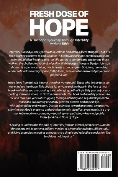 A Fresh Dose of Hope is a deeply personal and heartfelt journey through the struggles of infertility, grief, and the unwavering hope found in faith. Written by Daxton Johnson, a man who has experienced the emotional and spiritual turmoil of infertility alongside his wife, this book offers a unique perspective grounded in Christian faith and biblical teachings. Through candid storytelling, Johnson weaves together personal experiences with biblical stories of infertility, exploring the pain of childlessness, the complexities of IVF, miscarriages, and the emotional weight of trying to conceive. With raw honesty and a message of perseverance, A Fresh Dose of Hope serves as a source of comfort for those walking the difficult path of infertility, offering encouragement and spiritual insight to those who feel alone in their struggles. This book is for anyone who has faced the heartache of infertility, experienced the loss of a child, or is currently in the trenches of trying to build a family. It's also for those who want to understand and support loved ones going through these challenges. Through personal testimony, Bible study, and stories of others, Daxton Johnson leads readers to a profound conclusion: in our darkest moments, God's presence is as powerful as in our greatest victories. Whether you are seeking healing, support, or a deeper connection to your faith, A Fresh Dose of Hope will guide you with compassion, wisdom, and the promise that you are not alone.