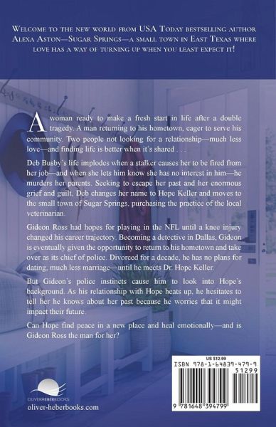 Welcome to the new world from USA Today bestselling author Alexa Aston-Sugar Springs-a small town in East Texas where love has a way of turning up when you least expect it! A woman ready to make a fresh start in life after a double tragedy. A man returning to his hometown, eager to serve his community. Two people not looking for a relationship-much less love-and finding life is better when it's shared . . . Deb Busby's life implodes when a stalker causes her to be fired from her job-and when she lets him know she has no interest in him-he murders her parents. Seeking to escape her past and her enormous grief and guilt, Deb changes her name to Hope Keller and moves to the small town of Sugar Springs, purchasing the practice of the local veterinarian. Gideon Ross had hopes for playing in the NFL until a knee injury changed his career trajectory. Becoming a detective in Dallas, Gideon is eventually given the opportunity to return to his hometown and take over as its chief of police. Divorced for a decade, he has no plans for dating, much less marriage-until he meets Dr. Hope Keller. But Gideon's police instincts cause him to look into Hope's background. As his relationship with Hope heats up, he hesitates to tell her he knows about her past because he worries that it might impact their future. Can Hope find peace in a new place and heal emotionally-and is Gideon Ross the man for her? Find the answer in A Fresh Start, Book 4 in Sugar Springs.