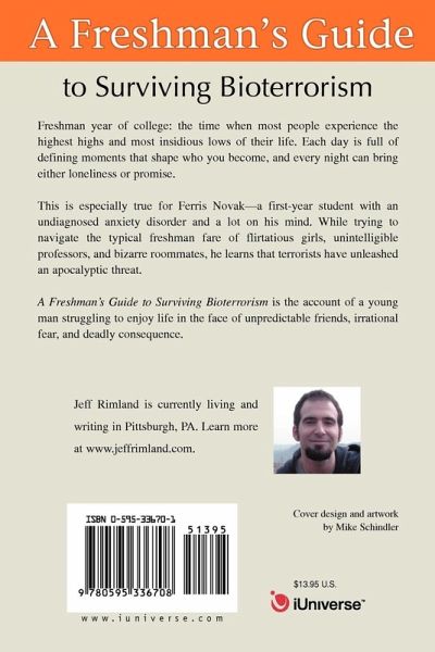 Freshman year of college: the time when most people experience the highest highs and most insidious lows of their life. Each day is full of defining moments that shape who you become, and every night can bring either loneliness or promise. This is especially true for Ferris Novak--a first-year student with an undiagnosed anxiety disorder and a lot on his mind. While trying to navigate the typical freshman fare of flirtatious girls, unintelligible professors, and bizarre roommates, he learns that terrorists have unleashed an apocalyptic threat. A Freshman's Guide to Surviving Bioterrorism is the account of a young man struggling to enjoy life in the face of unpredictable friends, irrational fear, and deadly consequence.