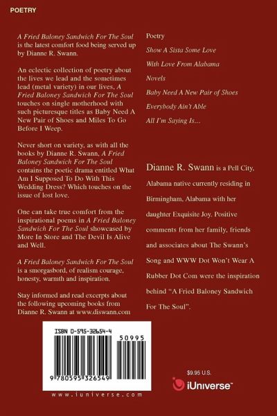 A Fried Baloney Sandwich For The Soul is the latest comfort food being served up by Dianne R. Swann. An eclectic collection of poetry about the lives we lead and the sometimes lead (metal variety) in our lives, A Fried Baloney Sandwich For The Soul touches on single motherhood with such picturesque titles as Baby Need A New Pair of Shoes and Miles To Go Before I Weep. Never short on variety, as with all the books by Dianne R. Swann, A Fried Baloney Sandwich For The Soul contains the poetic drama entitled What Am I Supposed To Do With This Wedding Dress? Which touches on the issue of lost love. One can take true comfort from the inspirational poems in A Fried Baloney Sandwich For The Soul showcased by More In Store and The Devil Is Alive and Well. A Fried Baloney Sandwich For The Soul is a smorgasbord, of realism courage, honesty, warmth and inspiration. Stay informed and read excerpts about the following upcoming books fro Dianne R. Swann at www.diswann.com Poetry Show A Sista Some Love With Love From Alabama Novels Baby Need A New Pair of Shoes Everybody Ain't Able All I'm Saying Is...