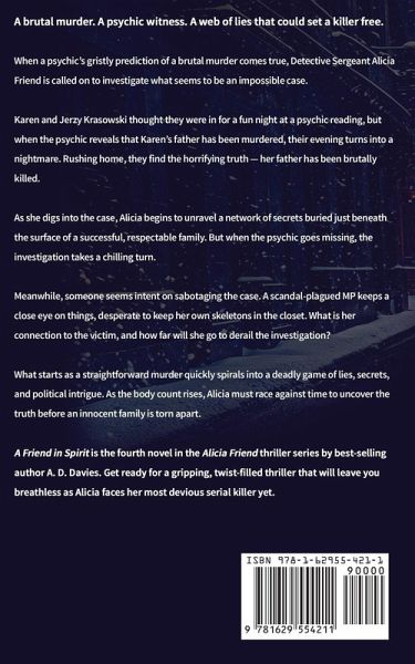 A brutal murder. A psychic witness. A web of lies that could set a killer free. When a psychic's gristly prediction of a brutal murder comes true, Detective Sergeant Alicia Friend is called on to investigate what seems to be an impossible case. Karen and Jerzy Krasowski thought they were in for a fun night at a psychic reading, but when the psychic reveals that Karen's father has been murdered, their evening turns into a nightmare. Rushing home, they find the horrifying truth - her father has been brutally killed. As she digs into the case, Alicia begins to unravel a network of secrets buried just beneath the surface of a successful, respectable family. But when the psychic goes missing, the investigation takes a chilling turn. Meanwhile, someone seems intent on sabotaging the case. A scandal-plagued MP keeps a close eye on things, desperate to keep her own skeletons in the closet. What is her connection to the victim, and how far will she go to derail the investigation? What starts as a straightforward murder quickly spirals into a deadly game of lies, secrets, and political intrigue. As the body count rises, Alicia must race against time to uncover the truth before an innocent family is torn apart. A Friend in Spirit is the fourth novel in the Alicia Friend thriller series by best-selling author A. D. Davies. Get ready for a gripping, twist-filled thriller that will leave you breathless as Alicia faces her most devious serial killer yet.