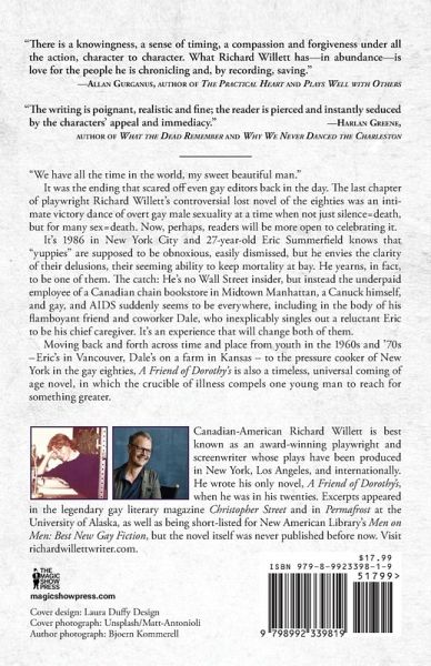 "We have all the time in the world, my sweet beautiful man." It was the ending that scared off even gay editors back in the day. The last chapter of playwright Richard Willett's controversial lost novel of the eighties is an intimate victory dance of overt gay male sexuality at a time when not just silence = death, but for many sex = death. Now, perhaps, readers will be more open to celebrating it. It's 1986 in New York City and 27-year-old Eric Summerfield knows that "yuppies" are supposed to be obnoxious, easily dismissed, but he envies the clarity of their delusions, their seeming ability to keep mortality at bay. He yearns, in fact, to be one of them. The catch: He's no Wall Street insider, but instead the underpaid employee of a Canadian chain bookstore in Midtown Manhattan, a Canuck himself, and gay, and AIDS suddenly seems to be everywhere, including in the body of his flamboyant friend and coworker Dale, who inexplicably singles out a reluctant Eric to be his chief caregiver. It's an experience that will change both of them. Moving back and forth across time and place from youth in the 1960s and '70s-Eric's in Vancouver, Dale's on a farm in Kansas-to the pressure cooker of New York in the gay eighties, A Friend of Dorothy's is also a timeless, universal coming of age novel, in which the crucible of illness compels one young man to reach for something greater. PRAISE FOR A Friend of Dorothy's "Nothing can have prepared you for the wit and insight, the eccentricity and inspiring optimism with which this consistently surprising young writer depicts a year at the heart of his generation's greatest calamity." -- Joseph Pintauro, author of Cold Hands and Raft of the Medusa "There is a knowingness, a sense of timing, a compassion and forgiveness under all the action, character to character. What Richard Willett has-in abundance-is love for the people he is chronicling and, by recording, saving." -- Allan Gurganus, author of The Practical Heart, Plays Well with Others, and Oldest Living Confederate Widow Tells All "The writing is poignant, realistic and fine; the reader is pierced and instantly seduced by the characters' appeal and immediacy." -- Harlan Greene, author of The German Officer's Boy, What the Dead Remember, and Why We Never Danced the Charleston Richard Willett's short stories have been published in Christopher Street, Hawaii Review, American Writing, Karamu, and Oxalis, among others, as well as short-listed for New American Library's Men on Men: Best New Gay Fiction, edited by David Bergman. His short play about AIDS Boys Will Be Boys was included in the anthology Art & Understanding: Literature from the First Twenty Years of A&U, and he is also the author of the plays Triptych, Random Harvest, The Flid Show, Tiny Bubbles, 9/10, A Terminal Event, and Grief at High Tide, presented off-off-Broadway and at theaters across the country. Honors include an Edward F. Albee Foundation Fellowship and a Tennessee Williams Scholarship, designation as a finalist for the Dramatists Guild National Fellows Program and the Sundance Labs, and listing twice in the Academy of Motion Picture Arts and Sciences' Nicholl Top 50. He lives in West Hollywood, California. Visit richardwillettwriter.com.