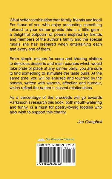 What better combination than family, friends and food! For those of you who enjoy presenting something tailored to your dinner guests this is a little gem - a delightful potpourri of poems inspired by friends and members of the author's family and the special meals she has prepared when entertaining each and every one of them. From simple recipes for soup and sharing platters to delicious desserts and main courses which would take pride of place at any dinner party, you are sure to find something to stimulate the taste buds. At the same time, you will be amused and touched by the poems, written with warmth, affection and humour, which reflect the author's closest relationships. As a percentage of the proceeds will go towards Parkinson's research this book, both mouth-watering and funny, is a must for poetry-loving foodies who also wish to support this charity. - Jan Campbell