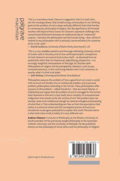A Frightening Love radically rethinks God and evil. It rejects theodicy and its impersonal conception of reason and morality. Faith survives evil through a miraculous love that resists philosophical rationalization. Authors criticised include Alvin Plantinga, Richard Swinburne, Marilyn McCord Adams, Peter van Inwagen, John Haldane, William Hasker.