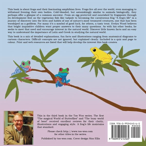 This book is about frogs, and their toad cousins, and their fascinating amphibian lives. Frogs live all over the world, even managing to withstand freezing their own bodies. Cold-blooded, but astonishingly similar to animals biologically, they perhaps offer a glimpse of a common ancestor. From an egg protected and nourished by frogspawn through its development first as the vegetarian fish like tadpole to becoming the carnivorous frog "A frog's life" is a journey of discovery into the lives and habits of one of nature's most treasured and diverse creatures. Worshiped as a goddess by the Egyptians and for many cultures a symbol of good luck, but for others, a tasty treat. A staple of French cuisine, an invaluable aid to scientists, biologists, Amazonian hunters and an early warning system of ecological problems. A frog’s life explores the contribution of these amphibians with Evelyn Wood’s usual mix of fact and fun, anatomical diagrams, cartoons a quiz and colouring pages.