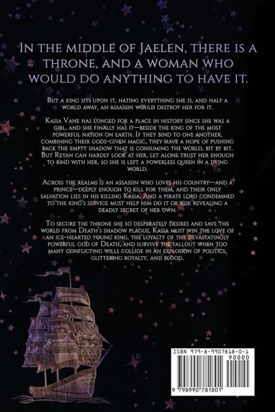 In the middle of Jaelen, there is a throne, and a woman who would do anything to have it. But a king sits upon it, hating everything she is, and half a world away, an assassin would destroy her for it. Kasia Vane has longed for a place in history since she was a girl, and she finally has it-beside the king of the most powerful nation on earth. If they bind to one another, combining their gods-given magic, they have a hope of pushing back the empty shadow that is consuming the world, bit by bit. But Reyan can hardly look at her, let alone trust her enough to bind with her, so she is left a powerless queen in a dying world. Across the realms is an assassin who loves his country-and a prince-deeply enough to kill for them, and their only salvation lies in his killing Kasia. And a pirate lord condemned to the king's service must help him do it or risk revealing a deadly secret of her own. To secure the throne she so desperately desires and save the world from Death's shadow plague, Kasia must win the love of an ice-hearted young king, the loyalty of the devastatingly powerful god of Death, and survive the fallout when too many conflicting wills collide in an explosion of politics, glittering royalty, and blood.