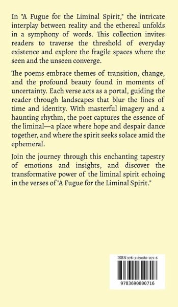 In "A Fugue for the Liminal Spirit," the intricate interplay between reality and the ethereal unfolds in a symphony of words. This collection invites readers to traverse the threshold of everyday existence and explore the fragile spaces where the seen and the unseen converge. The poems embrace themes of transition, change, and the profound beauty found in moments of uncertainty. Each verse acts as a portal, guiding the reader through landscapes that blur the lines of time and identity. With masterful imagery and a haunting rhythm, the poet captures the essence of the liminal-a place where hope and despair dance together, and where the spirit seeks solace amid the ephemeral. Join the journey through this enchanting tapestry of emotions and insights, and discover the transformative power of the liminal spirit echoing in the verses of "A Fugue for the Liminal Spirit."