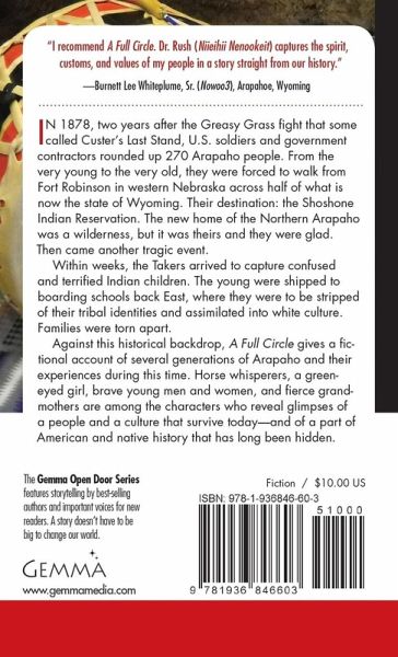 In 1878, two years after the Greasy Grass Fight that some called Custer's Last Stand, U.S. soldiers and government contractors rounded up 270 Arapaho people. From the very young to the very old, they were forced to walk from Fort Robinson in western Nebraska across half of what is now the state of Wyoming. Their destination: the Shoshone Indian Reservation. The new home of the Northern Arapaho was a wilderness, but it was theirs and they were glad. Then came a second and tragic event. Within weeks, the Takers arrived to capture confused and terrified Indian children. The young were shipped to boarding schools back east where they were to be stripped of their tribal identities and assimilated into white culture. Families were torn apart. Against this historical backdrop, A Full Circle gives a fictional account of several generations of Arapaho and their experience during this time. Horse-whisperers, a green-eyed girl, brave young men and women, and fierce grandmothers are among the characters that reveal glimpses of a people and a culture that survive today, and a part of American and native history that has long been hidden. A Full Circle is a story that needs to be told.