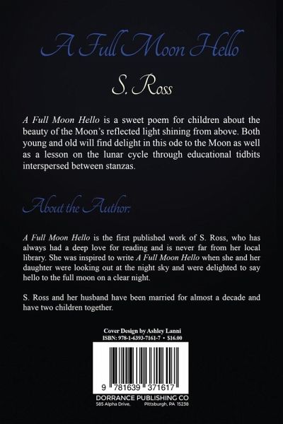 About the Book A Full Moon Hello is a sweet poem for children about the beauty of the Moon's reflected light shining from above. Both young and old will find delight in this ode to the Moon as well as a lesson on the lunar cycle through educational tidbits interspersed between stanzas. About the Author A Full Moon Hello is the first published work of S. Ross, who has always had a deep love for reading and is never far from her local library. She was inspired to write A Full Moon Hello when she and her daughter were looking out at the night sky and were delighted to say hello to the full moon on a clear night. S. Ross and her husband have been married for almost a decade and have two children together.