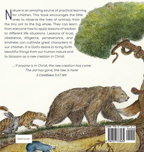This book aims to cultivate in children a love for God and for all His creation. There are many sources of instruction from God about the principles of life. Education is fun for little ones when it goes beyond the traditional classrooms and textbooks. Children are invited to have an amazing outdoor experience by observing and taking notes from all kinds of animals, insects, fish, and birds from which they learn valuable lessons. By acknowledging the wisdom of animals, children can get an idea of God's intelligent design. The memory verses help children to remember the lesson they learned and apply it to real-life situations. Moments of helplessness, fear, discouragement, hastiness, laziness, indifference, and disobedience are replaced with trust, faith, courage, patience, diligence, care for others, and obedience. This practical way of learning may shape behaviours and characters and prepare our children for Heaven.