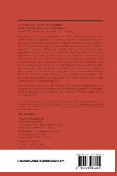 1 Introduction.- 1.1 The extent of parasitism.- 1.2 Definitions.- 1.3 The concept of harm.- 1.4 Some adaptations to parasitism.- 1.5 Life cycle and ecology.- >2 Population concepts.- 2.1 Background.- 2.2 General definitions.- 2.3 Factors affecting parasite populations.- 2.4 The dispersion concept.- 2.5 Dynamics of population growth.- 3 Factors influencing parasite populations.- 3.1 Density-independent factors: introduction.- 3.2 Density-independent factors: case histories.- 3.3 Density-dependent factors: introduction.- 3.4 Density-dependent factors: case histories.- 3.5 Suprapopulation dynamics: introduction.- 3.6 Suprapopulation dynamics: case histories.- 4 Influence of parasites on host populations.- 4.1 Introduction to the concept of regulation.- 4.2 Crofton's approach.- 4.3 Overdispersion and regulation: introduction.- 4.4 Overdispersion and regulation: case histories.- 4.5 Epidemiological implications.- 4.6 Models.- 5 Life history strategies.- 5.1 Introduction.- 5.2 Reproductive strategies.- 5.3 Colonization strategies.- 5.4 Host behaviour and transmission.- 5.5 Theoretical considerations.- 6 Infracommunity dynamics.- 6.1 Introduction.- 6.2 The evolution of parasite communities.- 6.3 Infracommunity structure.- 6.4 The screen/filter concept.- 7 Component and compound communities.- 7.1 Introduction.- 7.2 Core-satellite and generalist-specialist species concepts.- 7.3 Determinants of component communities.- 7.4 Habitat variability (succession) and parasitism.- 7.5 The biocoenosis and parasite flow.- 7.6 The allogenic-autogenic species concept.- 8 Biogeographical aspects.- 8.1 Introduction.- 8.2 Factors affecting the geographical distribution of parasites.- 8.3 Patterns of distribution.- 8.4 Ecological aspects.- 8.5 Applied aspects of biogeography.- 9 Evolutionaryaspects.- 9.1 Introduction.- 9.2 Microevolution.- 9.3 Evolution of host-parasite interactions.- 9.4 Parasite influence in the evolutionary biology of the host.- 10 Summary.- 10.1 Introduction.- 10.2 Population concepts.- 10.3 Factors influencing parasite populations.- 10.4 Influence of parasites on host populations.- 10.5 Life-history strategies.- 10.6 Infracommunity dynamics.- 10.7 Component and compound communities.- 10.8 Biogeographical aspects.- 10.9 Evolutionary aspects.- 10.10 What next for the evolution and ecology of parasitism?.- References.- Taxonomic host index.- Taxonomic parasite index.