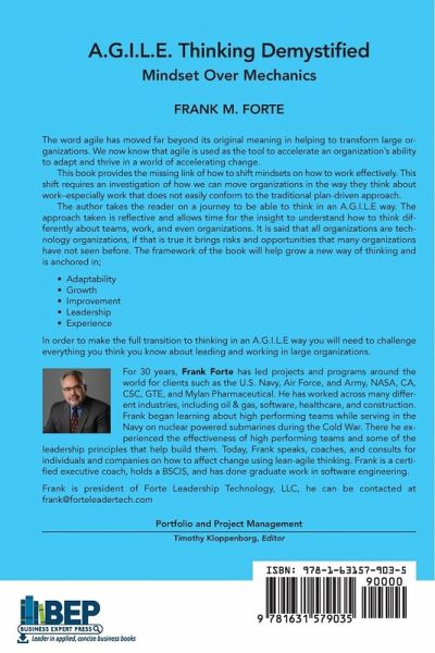 This book provides the missing link of how to shift mindsets on how to work effectively. The word agile has moved far beyond its original meaning in helping to transform large organizations. We now know that agile is used as the tool to accelerate an organization's ability to adapt and thrive in a world of accelerating change. This book provides the missing link of how to shift mindsets on how to work effectively. This shift requires an investigation of how we can move organizations in the way they think about work-especially work that does not easily conform to the traditional plan-driven approach. The author takes the reader on a journey to be able to think in an A.G.I.L.E way. The approach taken is reflective and allows time for the insight to understand how to think differently about teams, work, and even organizations. It is said that all organizations are technology organizations, if that is true it brings risks and opportunities that many organizations have not seen before. The framework of the book will help grow a new way of thinking and is anchored in: Adaptability; Growth; Improvement; Leadership; Experience. In order to make the full transition to thinking in an A.G.I.L.E way you will need to challenge everything you think you know about leading and working in large organizations.