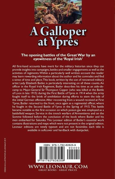 The opening battles of the Great War by an eyewitness of the 'Royal Irish' All first-hand accounts have merit for the military historian since they can provide insights into campaigns, battles and smaller engagements as well as the activities of regiments. Within a particularly well written account the reader may learn rewarding information about the author and his comrades and find a sense of time and place. This book, written by the son of renowned military artist Lady Elizabeth Butler, is particularly interesting on all these counts. An officer in the Royal Irish Regiment, Butler describes his time as an aide-de-camp to Major-General Sir Thompson Capper (who was killed at the Battle of Loos in late 1915) during the First Battle of Ypres in 1914 when the army fought itself to the brink of annihilation during efforts to stem the tide of the initial German offensive. After recovering from a wound received at First Ypres, Butler returned to the front, once again as a regimental officer, where he fought in the Second Battle of Ypres in the Spring of 1915. This battle became notable as the first occasion on which poison gas was employed as a battlefield weapon. Service in the trench warfare of Armentieres and on the Somme followed before the conclusion of the book where Butler and his men embarked for Salonika. This Leonaur edition of Butler's essential work contains illustrations and maps which were not present in the original edition. Leonaur editions are newly typeset and are not facsimiles; each title is available in softcover and hardback with dustjacket.