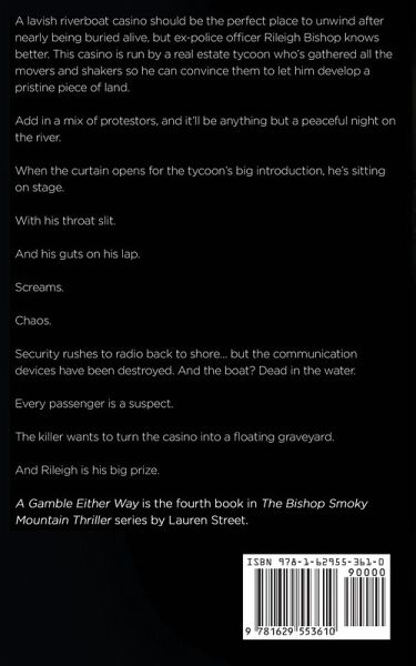 A lavish riverboat casino should be the perfect place to unwind after nearly being buried alive, but ex-police officer Rileigh Bishop knows better. This casino is run by a real estate tycoon who's gathered all the movers and shakers so he can convince them to let him develop a pristine piece of land. Add in a mix of protestors, and it'll be anything but a peaceful night on the river. When the curtain opens for the tycoon's big introduction, he's sitting on stage. With his throat slit. And his guts on his lap. Screams. Chaos. Security rushes to radio back to shore... but the communication devices have been destroyed. And the boat? Dead in the water. Every passenger is a suspect. The killer wants to turn the casino into a floating graveyard. And Rileigh is his big prize. A Gamble Either Way is the fourth book in The Bishop Smoky Mountain Thriller series by Lauren Street.