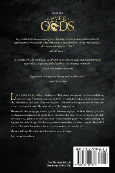 Life used to be good. I had money. I had fame. I had respect. The same thrill during work every day. A different woman in my bed every night. Best fighter to hire for dangerous jobs. Most famous thief in the Nineteen Kingdoms. Half the world sought my services when they needed the impossible done. The other half wanted to sleep with me. Then one day this strange guy showed up with his even stranger pet, the latter a bit of a gift horse by all accounts, and turned it all upside down. They claimed to have come to save my life, and while they were at it, I got them to help out with the most important quest of my existence: finding the Supreme Key of the Dragon. Needless to say, none of it turned out quite how I expected. But we had fun, even if it was hell sometimes. In the end, what we found was worth it all. My name is Conor Drew, the Gods destined me for great things. But I turned them down.